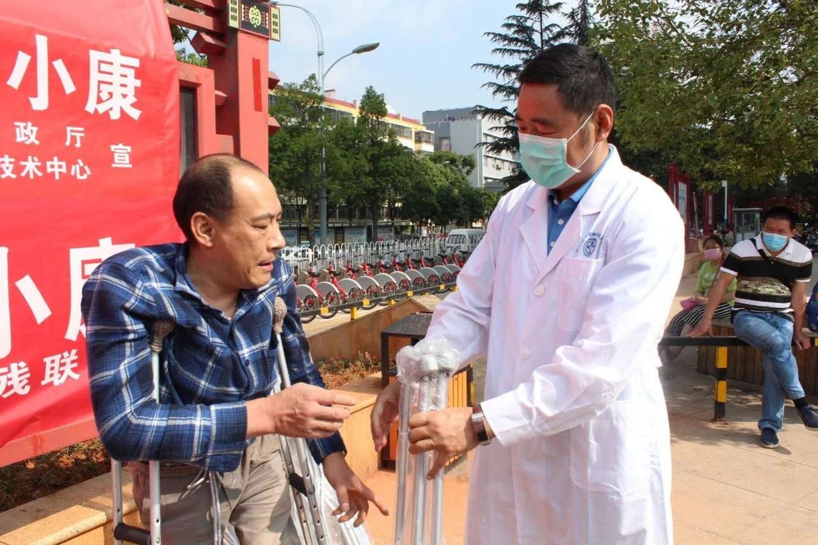 部分患者领取拐杖、残肢袜等康复辅具